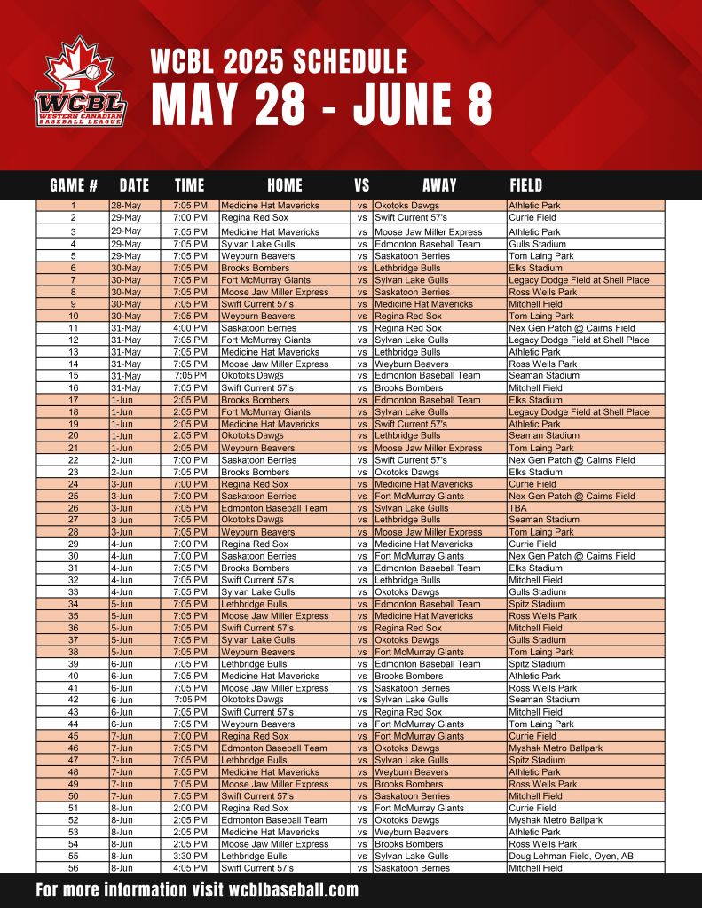 The 2025 Western Canadian Baseball League (WCBL) regular-season schedule is here.