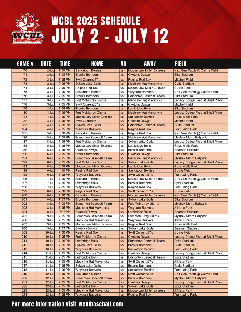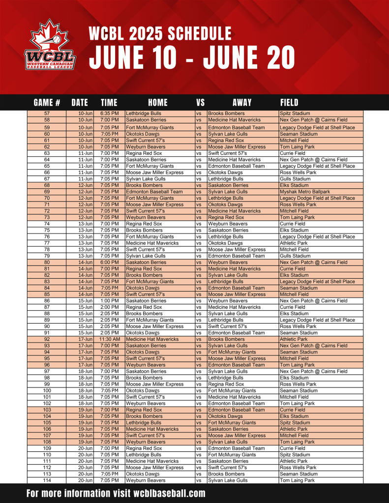 On Friday, May 30th, the Brooks Bombers kick off their season at Elks Field when the Lethbridge Bulls pay a visit. The Gulls will fly north to Fort McMurray for a Friday night tilt against the Giants at Legacy Dodge Field at Shell Place. The first game of the 2025 season at Ross Wells Park in Moose Jaw will feature the Miller Express and the Berries doing battle, while the Mavs travel to Mitchell Field in Swift Current for the 57’s home opener.