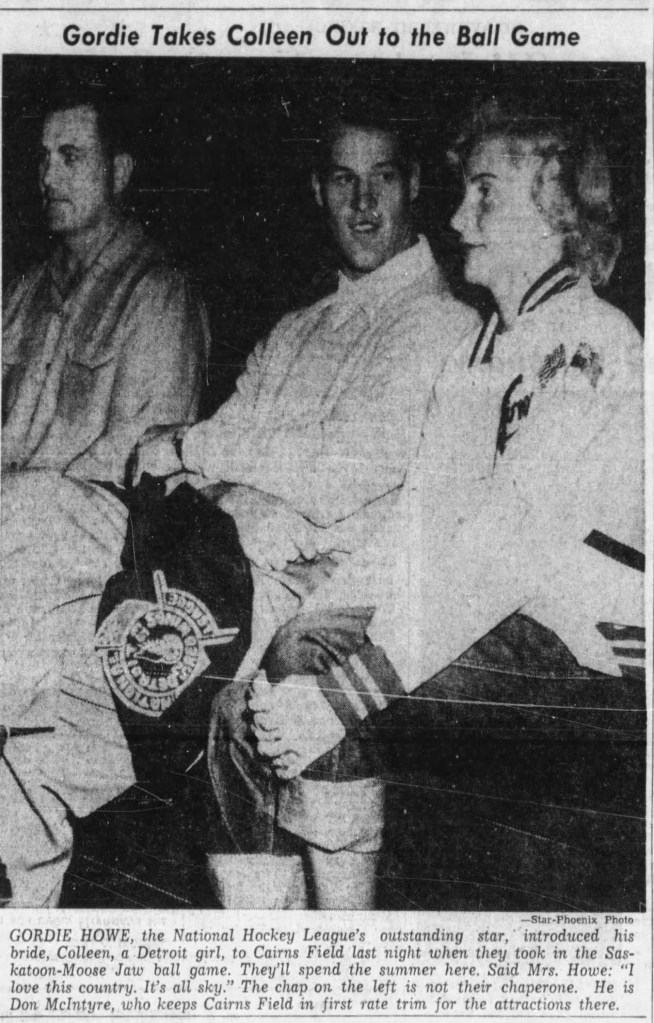 Howe returned to playing both softball with the Dorns and baseball with the Saskatoon Legion in the Northern Saskatchewan Baseball League. In nine games for the Dorns, Howe belted three homers and batted .286. He added several more round trippers with the Legion and during exhibition play. Mixed in with the newspaper reports of his time at Cairns Field were articles of Howe’s exploits playing soccer and swinging clubs on the golf course. If he was suffering any ill effects from his hockey injury, they didn’t appear to be on display.