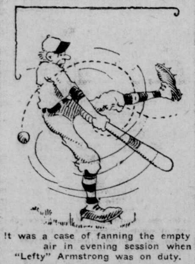“’Lefty’ Armstrong gave about the niftiest all-round sample of pitching ability in the evening affair when he held the Greys to a solitary bingle,” the Sun continued. “The long hit was a sizzler from Bill Porter’s bat, but it was the only hit that got away.”